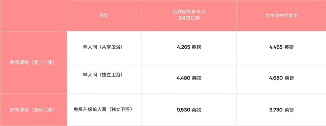 本项目面向我校在读学生提供专项学费减免900英镑的支持政策。于3月15日前完成官网申请的学员,可在上述优惠基础上额外享受200英镑早鸟申请减免,并在住宿房型选择上享有优先权。